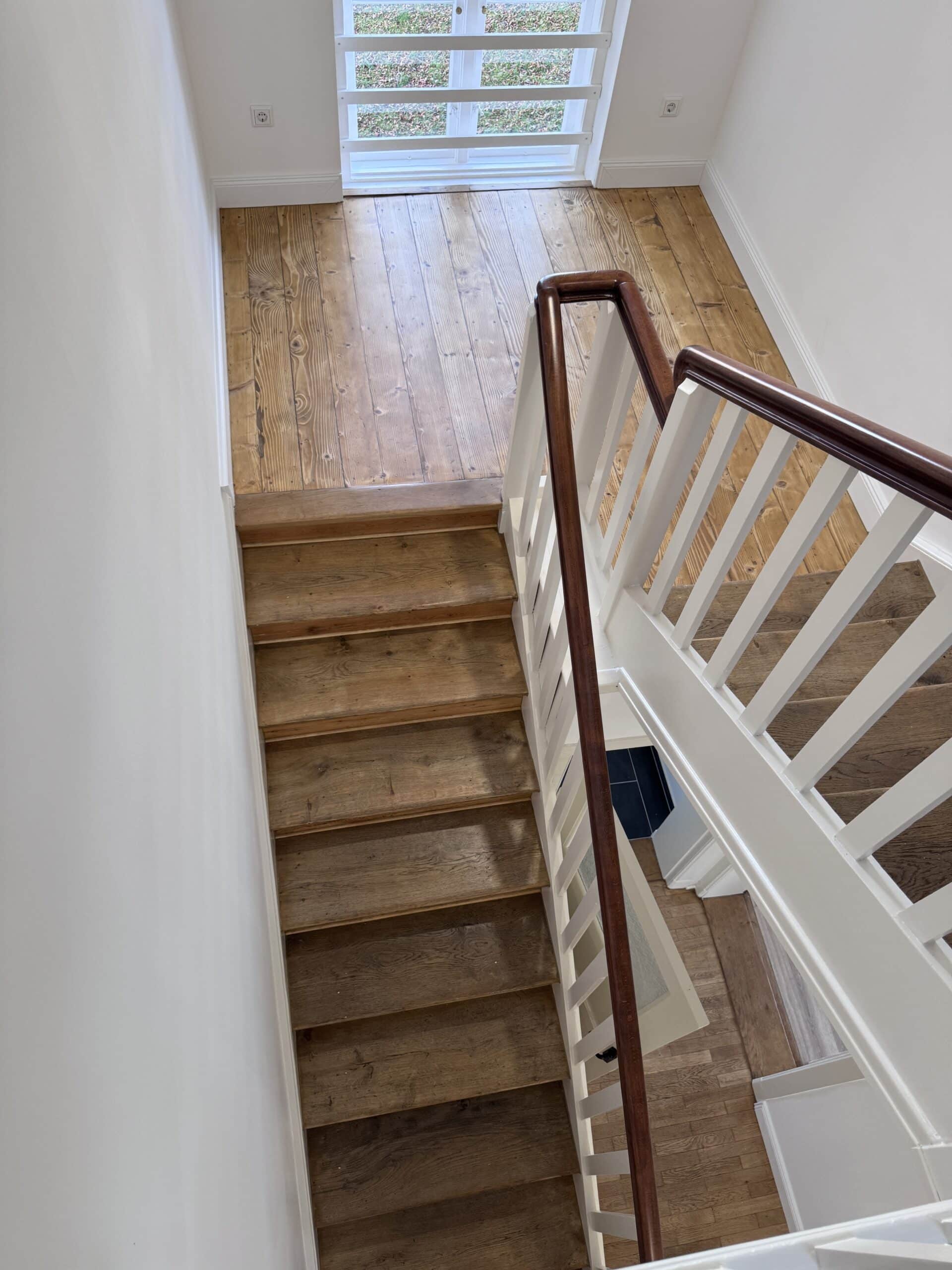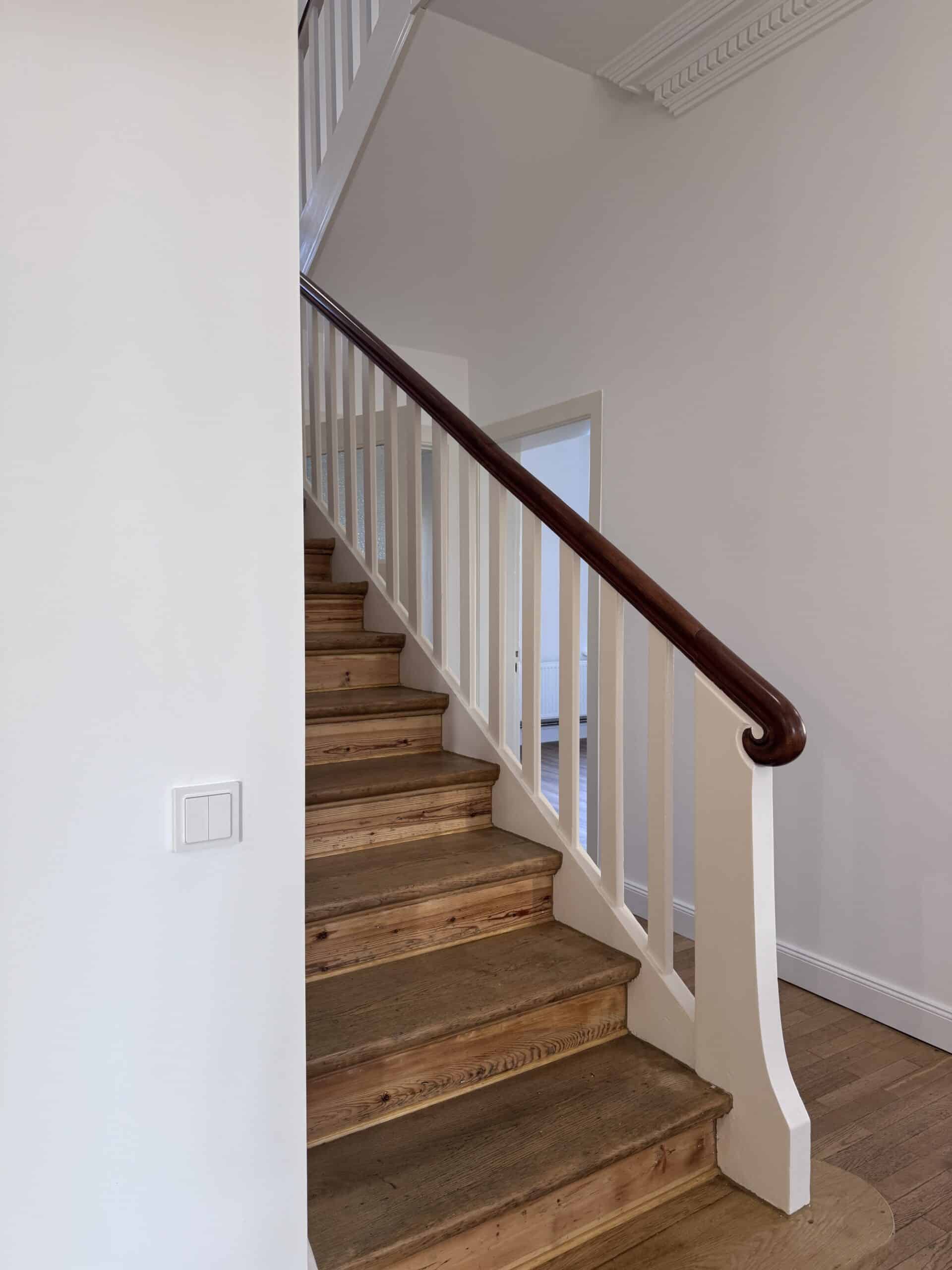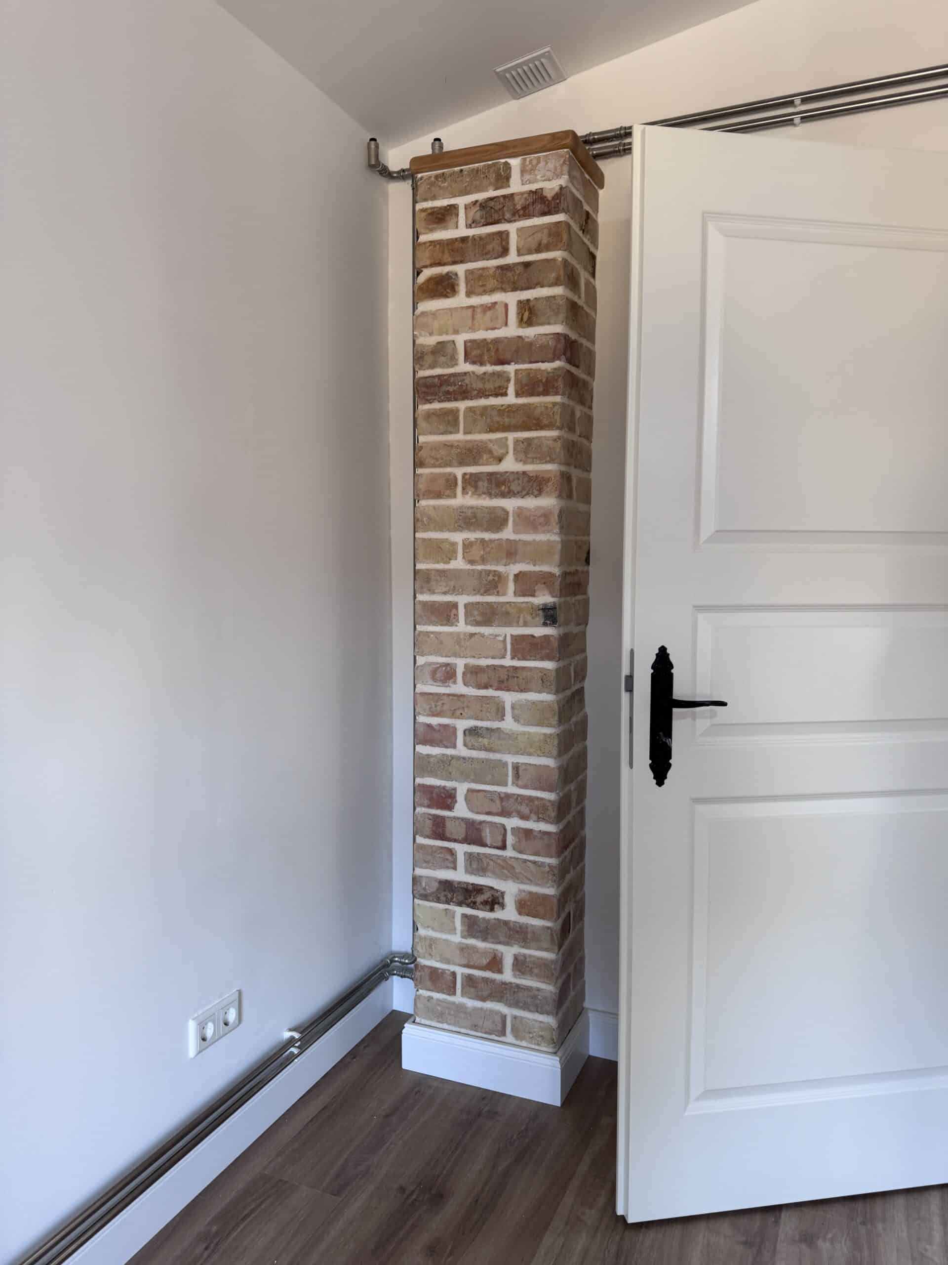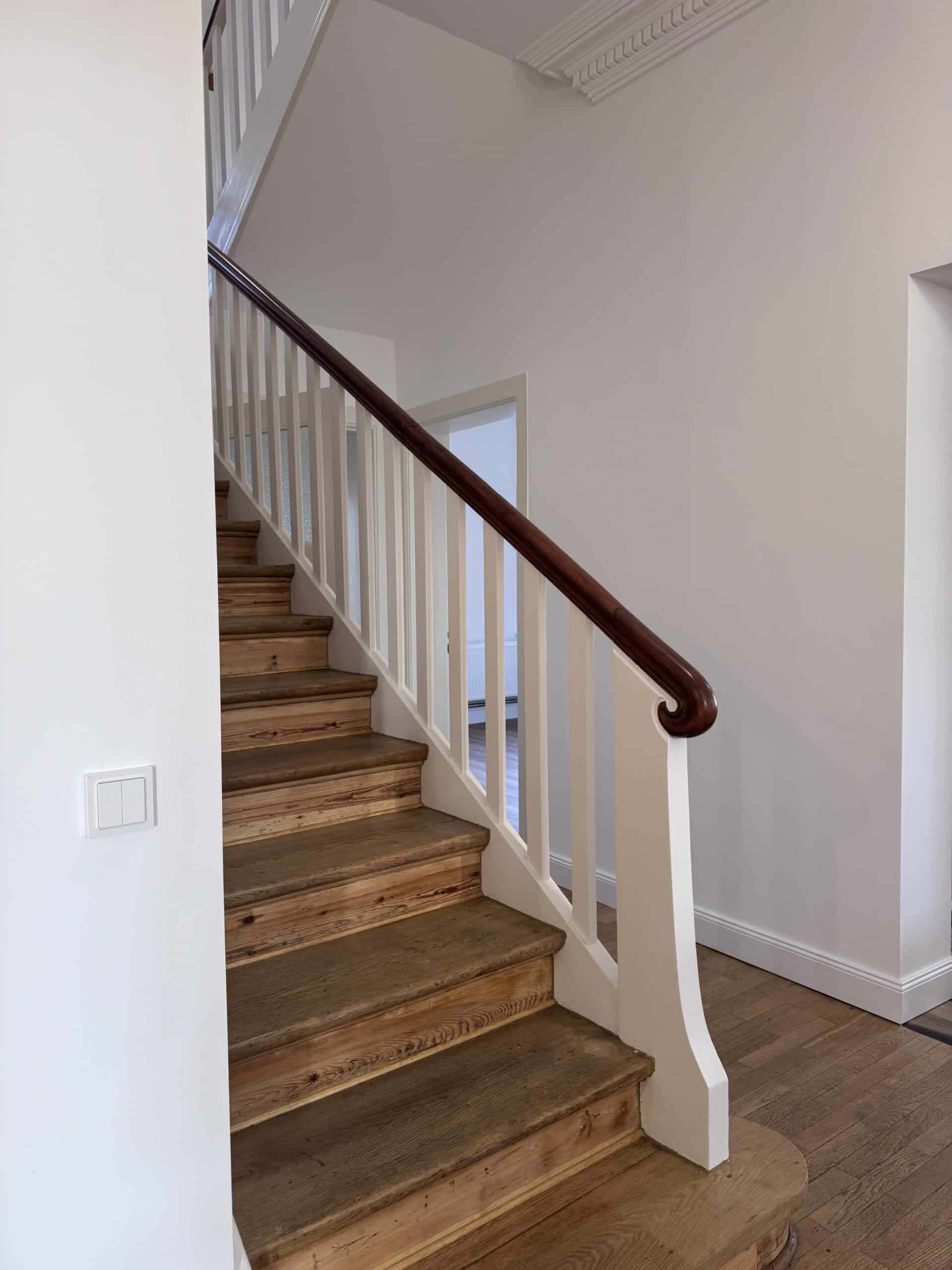 Historie trifft Moderne: Freigelegte Details wie die charakteristischen Sichtmauerwerke und die originalen, aufgearbeiteten Holzstrukturen (Balken und Dielenböden) wurden bewahrt.